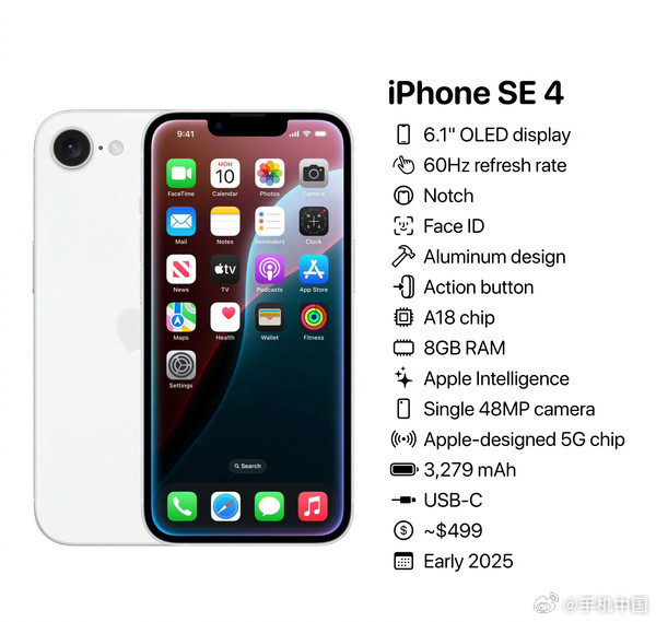 近日,外网流传出一张疑似苹果新机iPhone SE 4的外观和详细参数表,引起了网友关注。从曝光的图片来看,iPhone SE 4采用了6.1英寸的OLED显示屏,支持60Hz刷新率,采用刘海屏设计,支持Face ID面部识别功能。在硬件配置上,iPhone SE 4搭载了A18芯片和8GB RAM,支持Apple Intelligence功能。