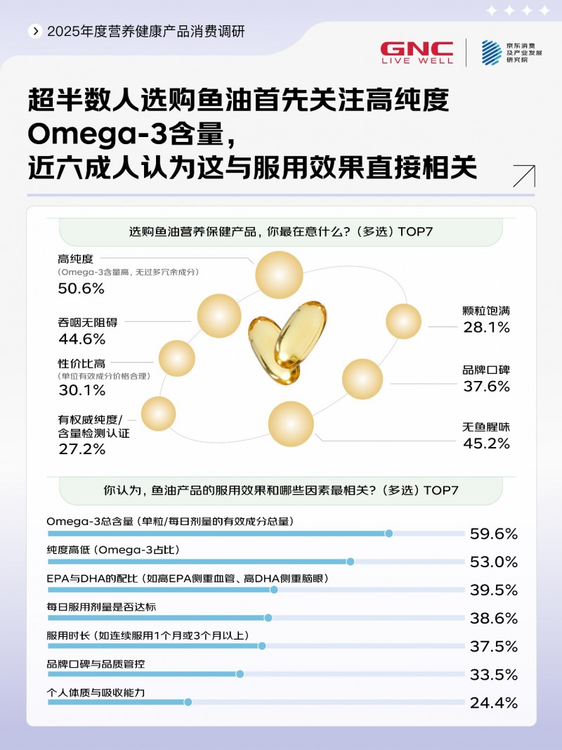 调研显示,2025年有51%的消费者购入了鱼油产品,同时,高纯度Omega-3成为超半数人选购鱼油产品时的第一关注点,还有59.6%的消费者认为,鱼油的服用效果与Omega-3总含量直接相关。