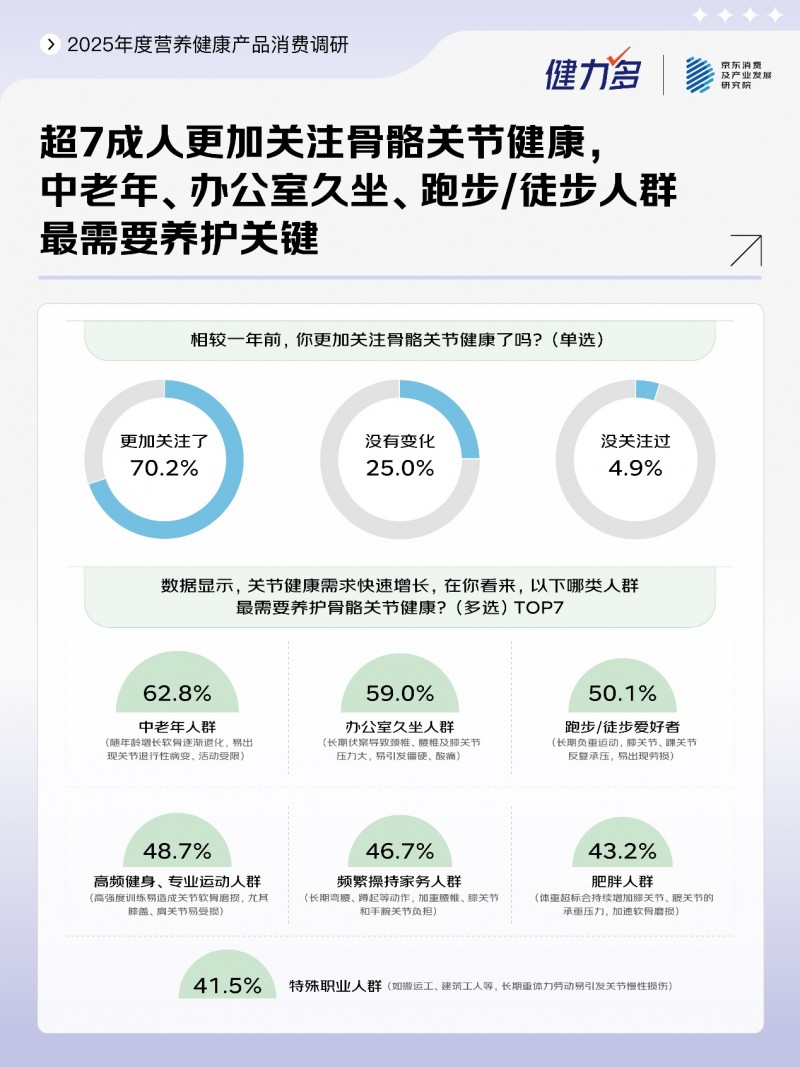 联合洞察显示,关节养护需求正从“中老年缓解”延伸至全年龄段“主动预防”,产品端也从“氨糖+软骨素”的广谱配方,转向了“人群细分+场景定制+成分复配”的精准化升级方向。