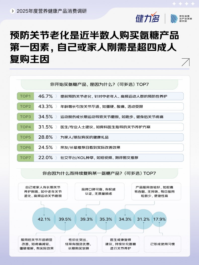 调研显示,在氨糖产品的复购反馈中,自己或家人有长期关节养护刚需是第一因素,服用后关节不适明显改善是第二大驱动因素,消费者非常关注产品效果,如减轻疼痛、僵硬缓解等。消费决策早已从“看广告”转向了“重实效”,这也促使品牌展开循证医学验证。健力多耗时近4年、联合权威机构完成了全球首个氨糖产品万人级大规模真实世界研究。
